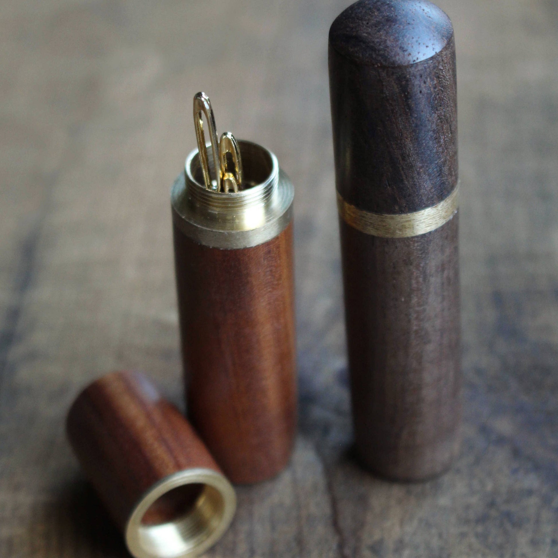 A beautiful wooden case to hold your sewing needles. Lid unscrews easily to quickly access the contents. This case includes a set of tapestry needles in 3 different sizes.